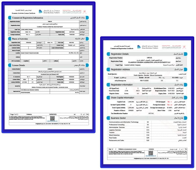 فلامینگو دارای تخصص کامل در تمامی مقررات مورد تأیید مراجع رسمی سلطنت عمان است و با همکاری وکلای مجرب عمانی، خدماتی با بالاترین کیفیت و کاملاً منطبق با قوانین ارائه میدهد.